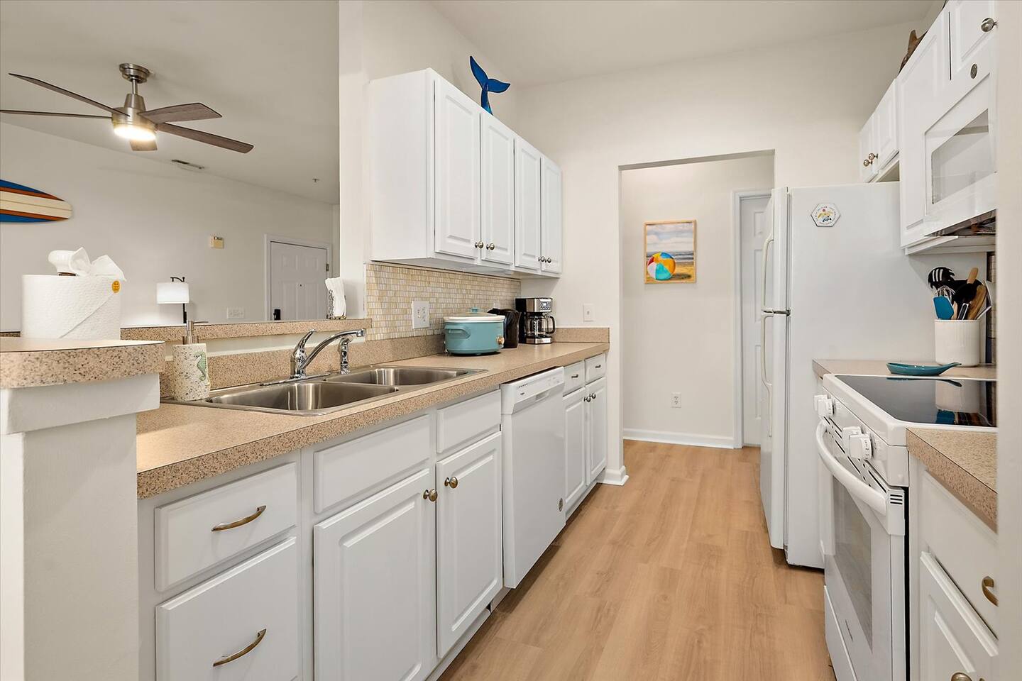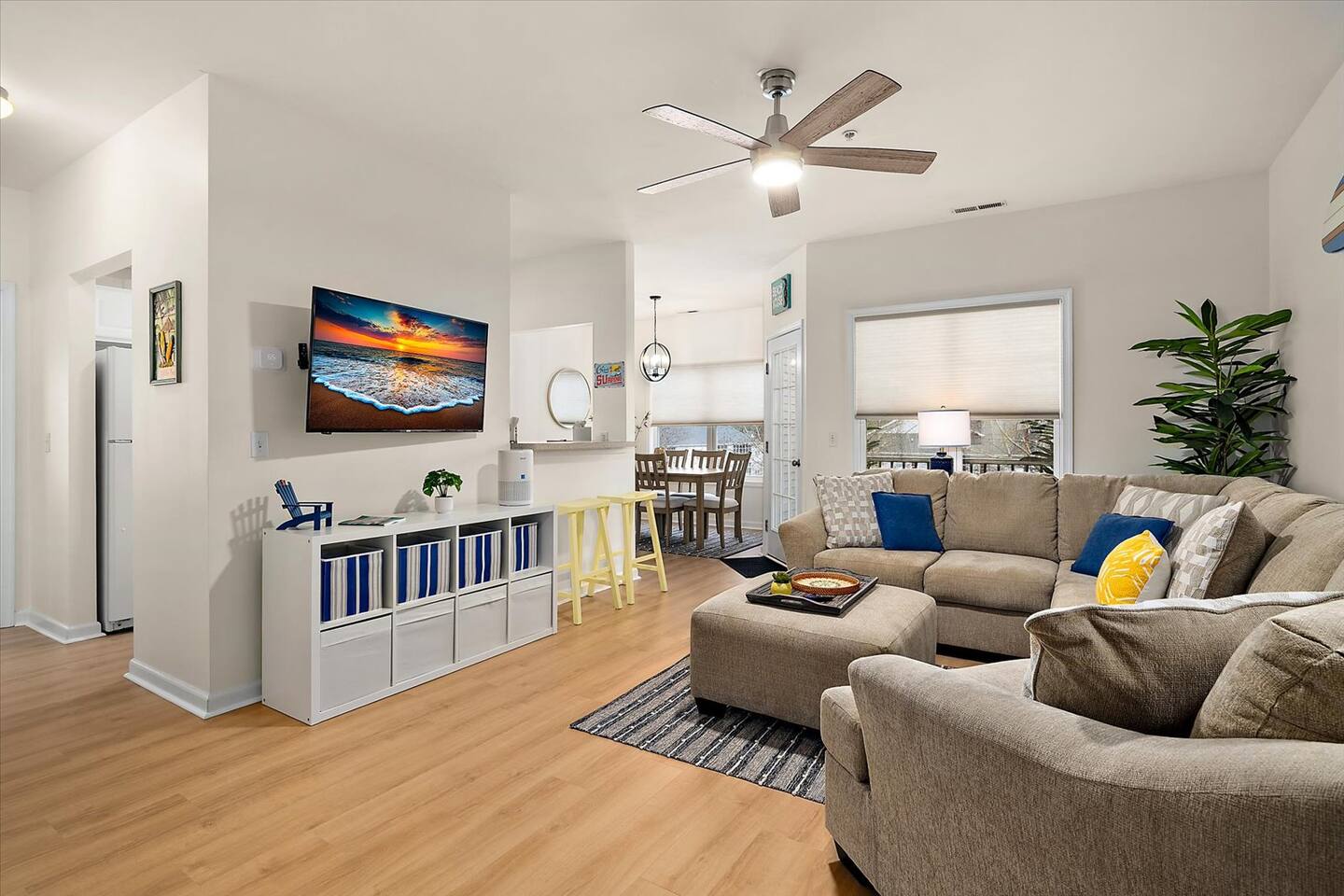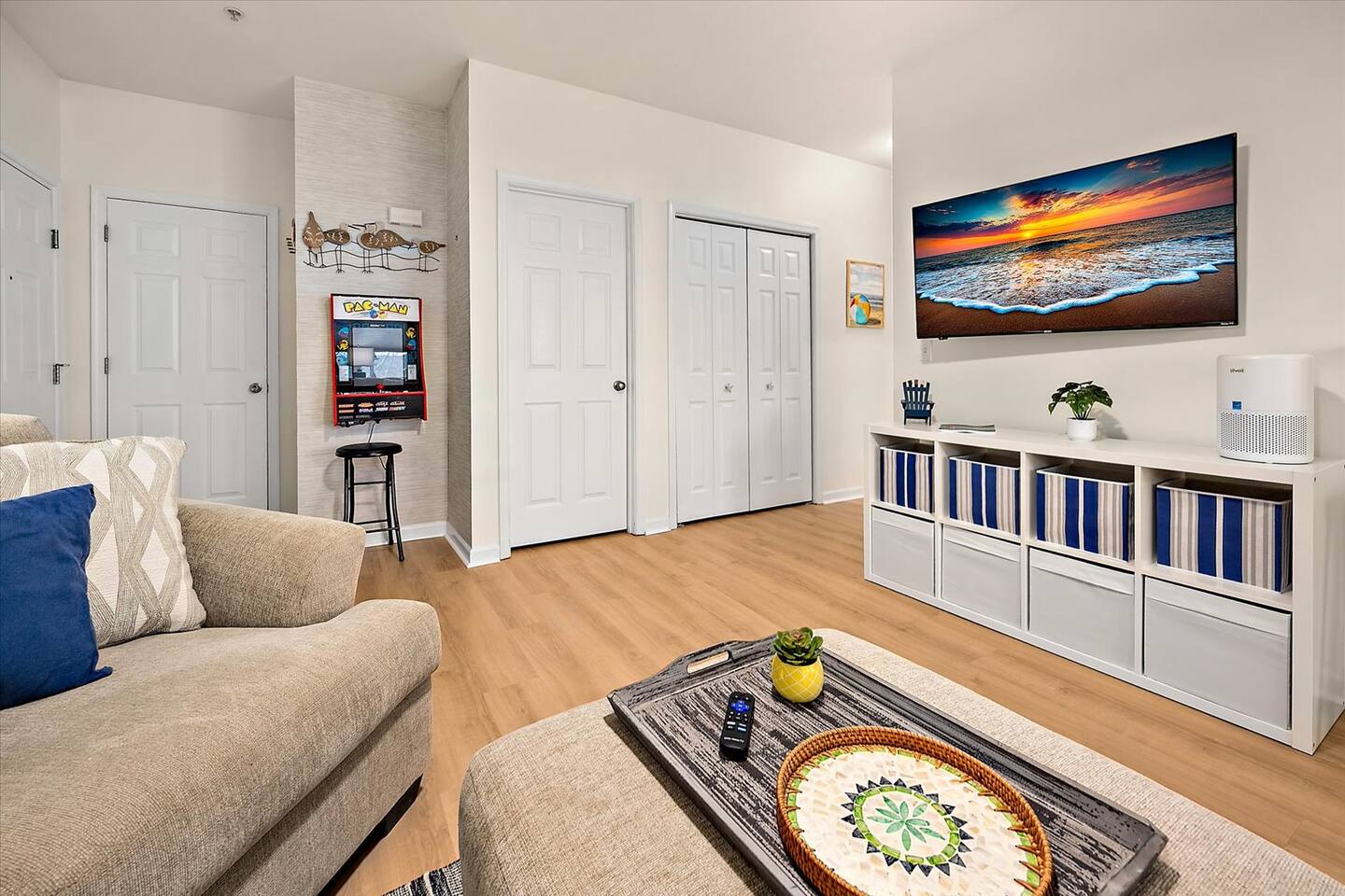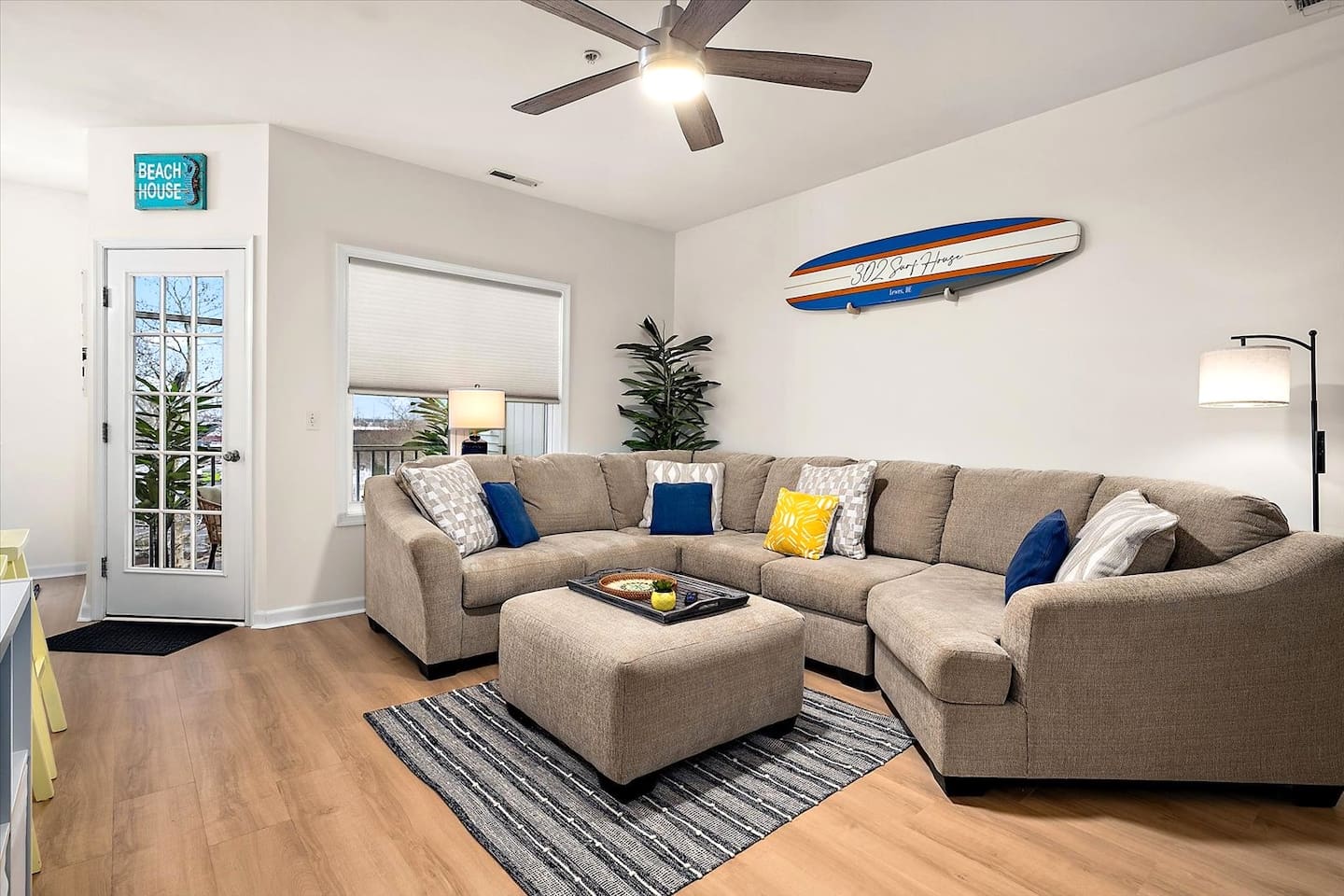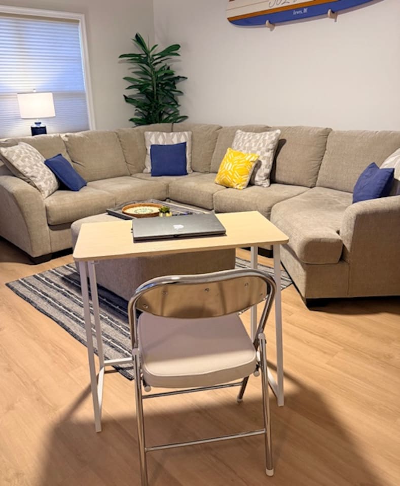 302 Surf House is your beach getaway is designed for comfort, relaxation, and effortless vacation living. Everything is thoughtfully curated to help you unwind after a day of beach adventures. Location: You’re perfectly located to enjoy the best of Delaware’s beaches and attractions! Catch stunning sunsets at Savannah Beach, start your day with sunrise walks and ocean breezes at Cape Henlopen State Park, or spend the afternoon along the Rehoboth Beach boardwalk—all just minutes away. Walk to nearby restaurants without crossing Route 1, or take a quick drive to Lewes and Rehoboth for boutique shopping, Tanger Outlets (tax-free!), movie theaters, bowling at Lefty’s, rooftop mini-golf, go-karts, water parks, and local vineyards. Love the outdoors? Hop on the scenic Junction & Breakwater Trail, a beautiful 6-mile path connecting Lewes and Rehoboth—perfect for walking, biking, and stopping at great local eateries along the way. Getting around is easy with the DART Park-and-Ride and Cape May–Lewes Ferry just minutes away, making day trips and coastal exploring effortless. Whether you’re here to relax, explore, or do a little of both, everything you need for a perfect beach getaway is right at your doorstep Living Room: Kick back on the expansive sectional with deep seating and ottoman—perfect for stretching out during movie nights on the 50" 4K Roku TV. Enjoy the Pac-Man arcade, extra blankets, and a stash of board and card games for rainy days or late-night fun. Additional seating at the bar keeps everyone connected. Kitchen & Dining: Whether you're making breakfast before the beach or dinner after a day exploring Lewes and Rehoboth, the fully stocked kitchen has everything you need—multiple pans and cookware, casserole dishes, waffle maker, electric griddle, family-size slow cooker, barware, a coffee maker, electric kettle, spices, olive oil, vinegar, coffee, and tea. The dining table seats six. Bedrooms & Bathrooms: Rest comes easy with brand-new mattresses & fresh linens. Primary Suite: King bed, ensuite bathroom, 43” 4K Roku TV, dresser, full-length mirror, and walk-in closet. Second Bedroom: Two full beds, 43” 4K Roku TV, dresser, and walk-in closet—with a partial pool view. Each bathroom includes fresh towels, bath mats, starter toiletries, and toilet paper (2 rolls per bathroom provided). Private Screened Balcony: Start your day with coffee or end it with a breeze—your balcony offers complete privacy with no neighboring views. The attached storage closet is fully stocked with beach essentials, including beach chairs, an umbrella, beach towels, toys, and a cooler. Laundry & Essentials A separate laundry room with a brand-new washer & dryer, baskets, starter detergent, iron, and ironing board makes longer stays a breeze. Work & Play: With 500 Mbps high-speed Wi-Fi and a movable desk and chair, working from vacation has never been easier—set up in any room or on the balcony. Pool & Parking: The beautiful community pool is just steps away, with guest access and towels provided. Parking is free and unassigned. 302 Surf House is more than a stay—it's your home by the beach, where relaxation, convenience, and the best of coastal Delaware come together. Drop your bags, kick off your shoes, and start making memories.